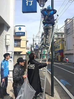 3月25日(土)には百合ヶ丘駅周辺のタペストリー付け替え作業を実施。