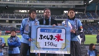 この試合の「あんたが大将」は小林選手と中村選手。贈呈者はエバラ食品で「エバラ食品の詰め合わせ」。スポンサーを巻き込んだ表彰。そして中原区商店街連合会青年部より「フロンターレカラーの花束」。「地元感が満載でいいですねー。毎年新シーズンにはいろんな商店街を回って、選手達が挨拶に行きます。そういった地域、地元のサポートがある。それがフロンターレ」「ピッチ外でもいろんな引き出しがある。わくわくさせてくれるチームカラー。企画を立ち上げて、お客さんを巻き込んで盛り上げてきた。ゲーム前、ゲーム後の事をしっかり考えてくれている。昔、川崎にロッテ球団があった縁から、今でもロッテと連携している。得点王の小林選手には、そのロッテから「ゴールいっぱい、ロッテチョコパイ」を贈呈。しっかり自分のところで準備していました。