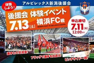「アルビレックス新潟後援会では、7月13日(土)横浜FC戦にて、まだ後援会に入会していない方を対象に、後援会を体験できる「後援会体験イベントデー」を開催いたします。選手との交流会やスワン旗めき隊など1日を通して、クラブをサポートするだけでなく、クラブを身近に感じることができる後援会を体験しよう!