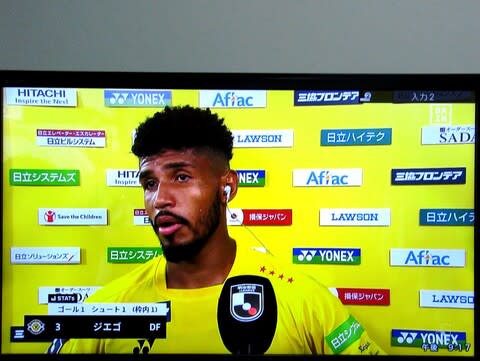 ロスタイム。鵜木選手から縦パス、ジエゴ選手がヘッドでねじ込んで逆転。★★★柏ゴォール!!! ジエゴゴール!★★★ 2ー1。今季初得点、すごいゴールでした。いい外国人助っ人だと思います。岡山の星、島村選手もよく映ります。ここでホイッスル。勝ちました。